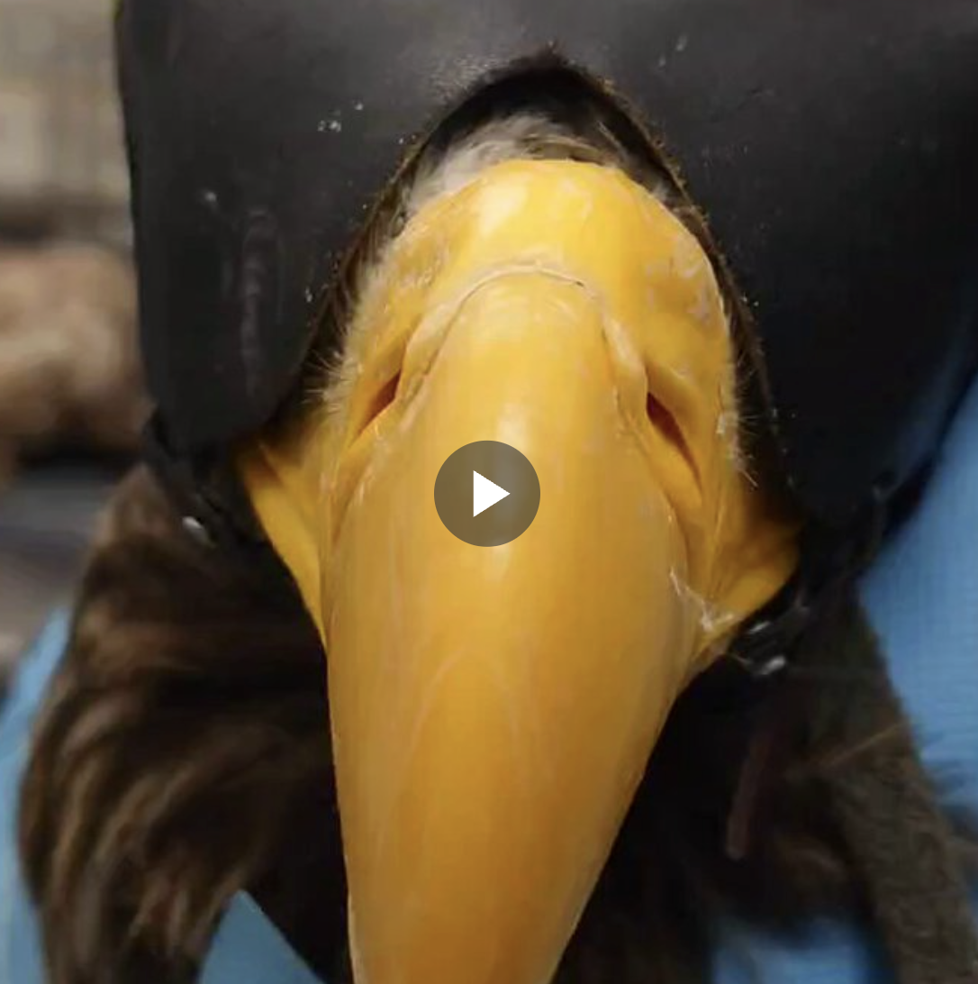 目隠し用のフード(頭巾)を かぶったオオワシ 体重測定などの検査の間、 とてもおとなしくしてくれていました けれど フードを外したら… あ…怒って…いらっしゃる?
