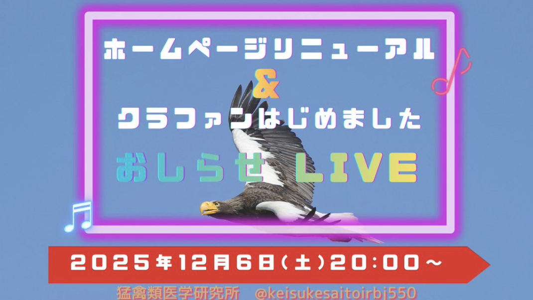 急なお知らせとなり恐縮ですが YouTubeライブをやります 12/6(土) 20:00~ 猛禽類医学研究所 齊藤慶輔チャンネルにて @keisukesaitoirbj550 久しぶりなこともあり うまく配信できるかドキ […]