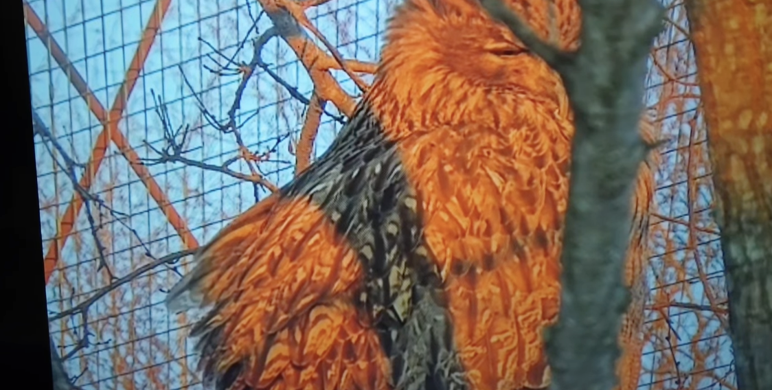 夕日に染まるシマフクロウ “なつ” リハビリは順調に進んでいます! それにしても真っ赤だな。。 #シマフクロウ保護増殖事業 #環境省釧路湿原野生生物保護センター #猛禽類医学研究所