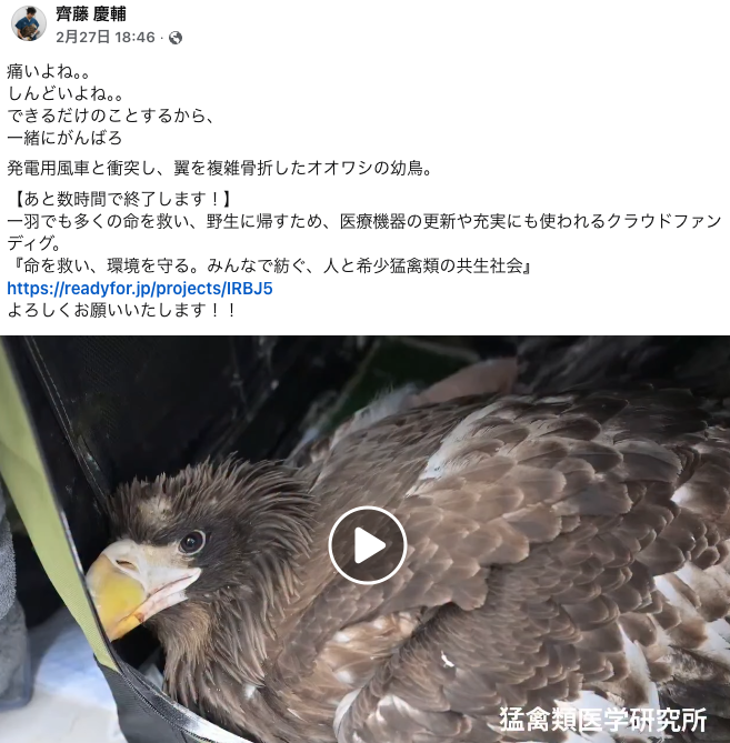 道北でバードストライク(風車衝突)に遭い、翼に大怪我を負ったオオワシの幼鳥。今日はしっかり起立してくれていた。置き餌はまだ手が着けられてなかったが、こちらを見る眼差しは以前よりも力が出てきたように思える。 今週は道北地方 […]