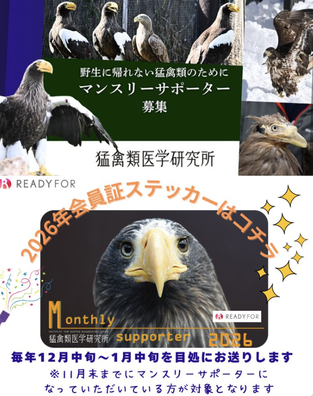 人と野生猛禽類とのより良い共生を 猛禽類医学研究所マンスリーサポーター募集中 サポーター特典の一つ、2026年会員証ステッカーは11月末までにご登録いただいた方が対象となります https://readyfor.jp/p […]