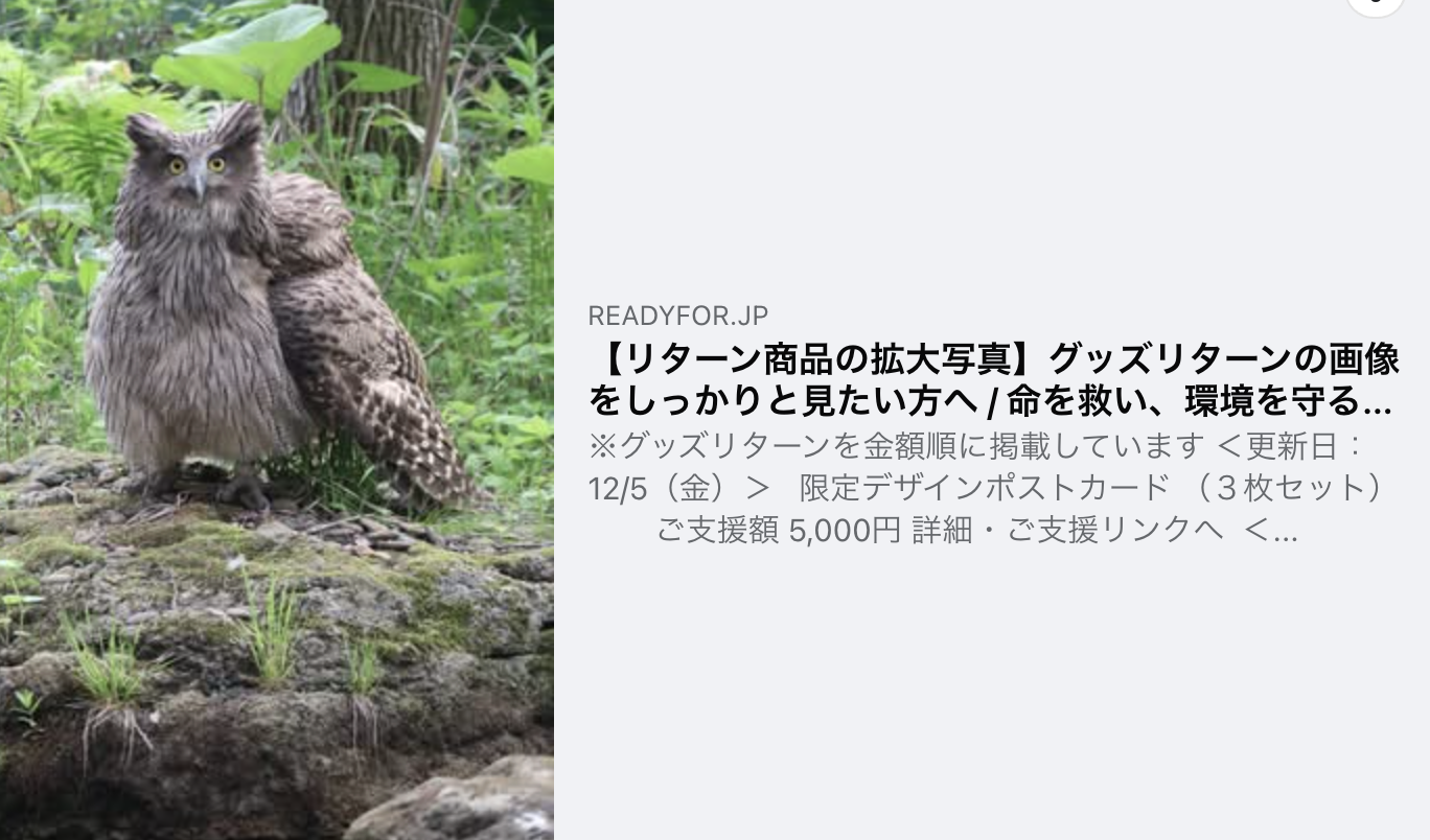 【クラファンリターン紹介】 ■ エコバッグ 〜夜に溶けるシマフクロウ~ 毎年恒例の限定エコバッグ! 深い闇の中、シマフクロウが大きな翼を広げている様子をデザインしました! ポリエステル製の大容量エコバッグです。内側ポケッ […]