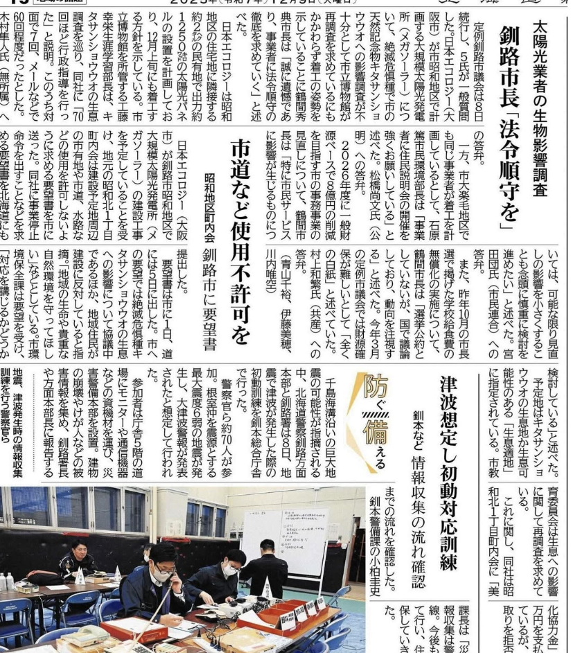 釧路・昭和メガソーラー計画 釧路市長「法令順守を」 事業者の生物影響調査:北海道新聞デジタル 定例釧路市議会は8日続行し、5氏が一般質問した。日本エコロジー(大阪市)が市昭和地区で計画する大規模太陽光発電所(メガソーラー […]