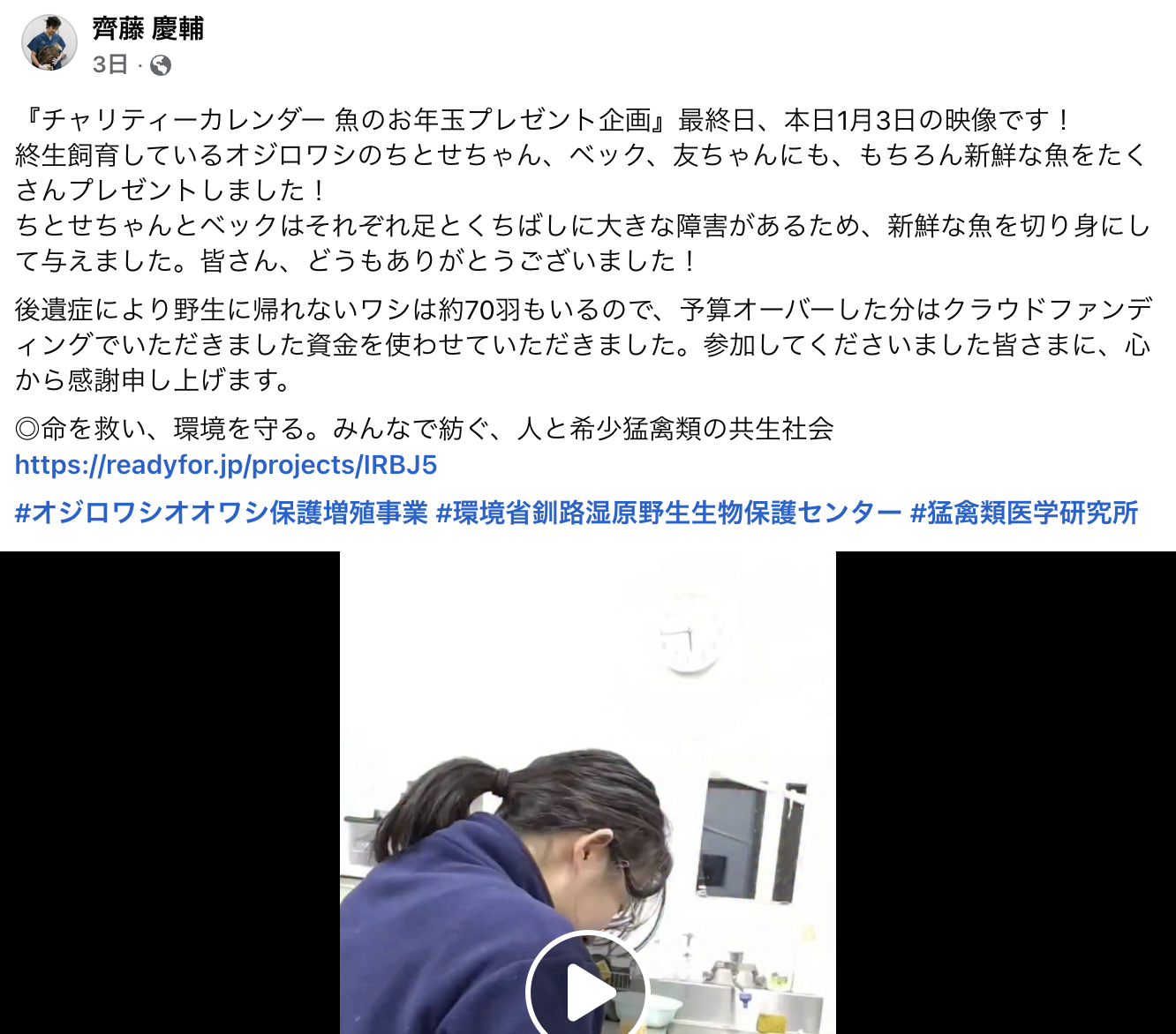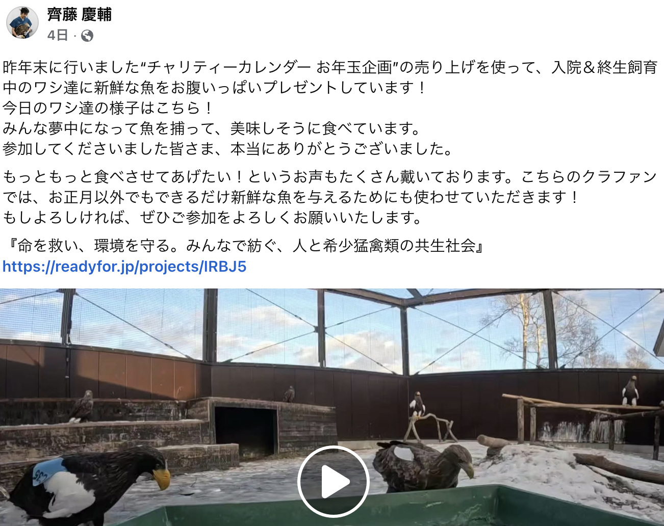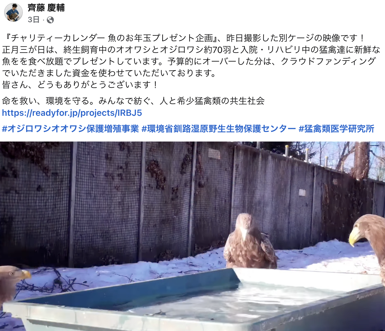 昨年末に実施しましたチャリティーカレンダー企画の売り上げで、入院している猛禽や後遺症により終生飼育となっているワシ達に新鮮な魚をお年玉としてプレゼントしました!ご協力いただきました皆さま、本当にありがとうございました! […]