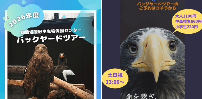 バックヤードツアー予約受付開始のお知らせ 釧路湿原野生生物保護センターで実施しているバックヤードツアーについて、2026年度の予約受付を3月29日10時より開始いたします。 新年度も引き続き、猛禽類医学研究所にて実施でき […]