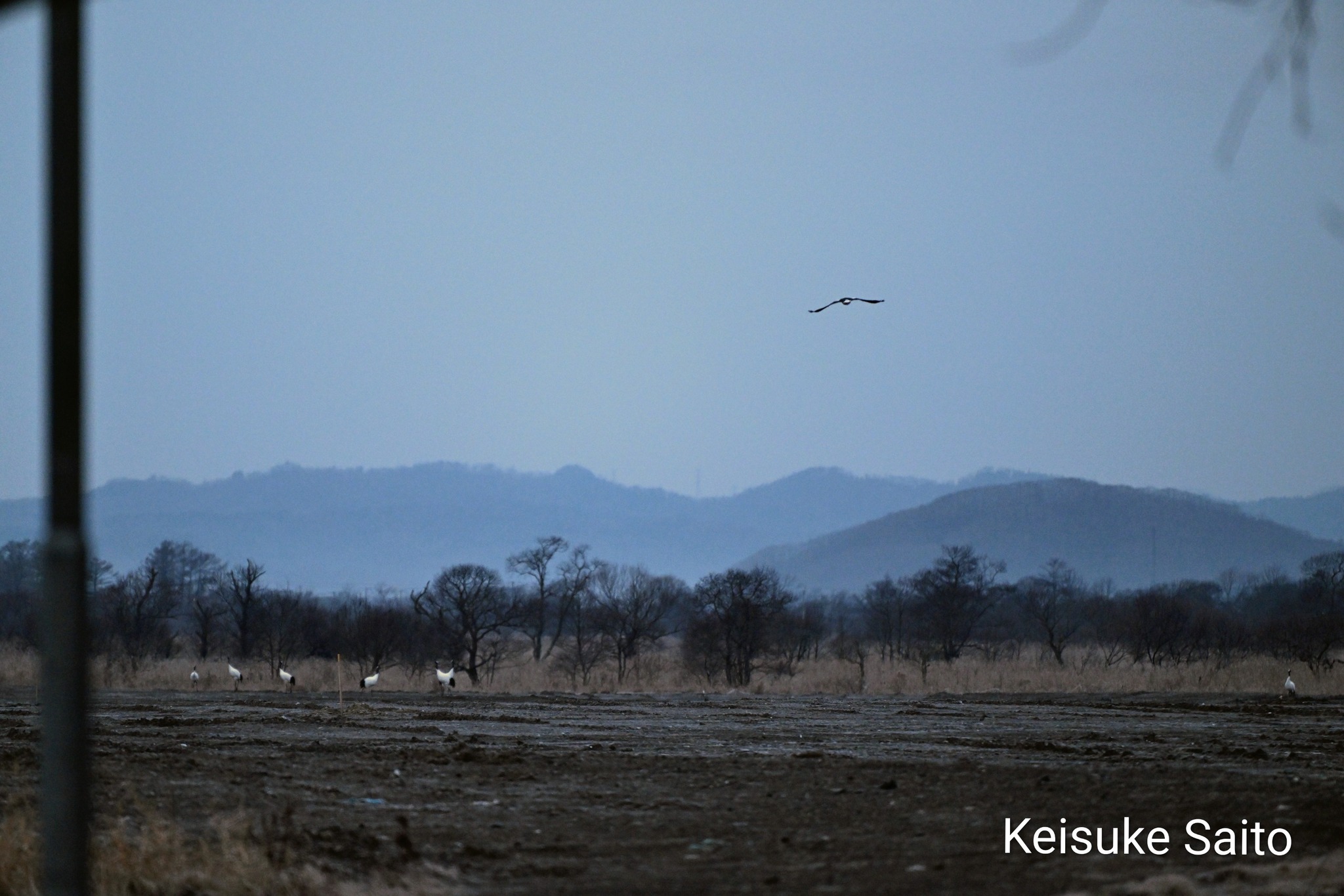 今朝のメガソーラー建設現場。すぐ隣の湿性林でねぐらを取っていたオジロワシが飛び立ち、タンチョウの上空を飛翔していった。