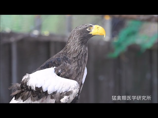 交通事故で片翼になったオオワシ。はるばる北海道まで飛んできたことを考えると、このような姿にした人間の罪深さを感じずにはいられない。できる限り快適な余生を送っても