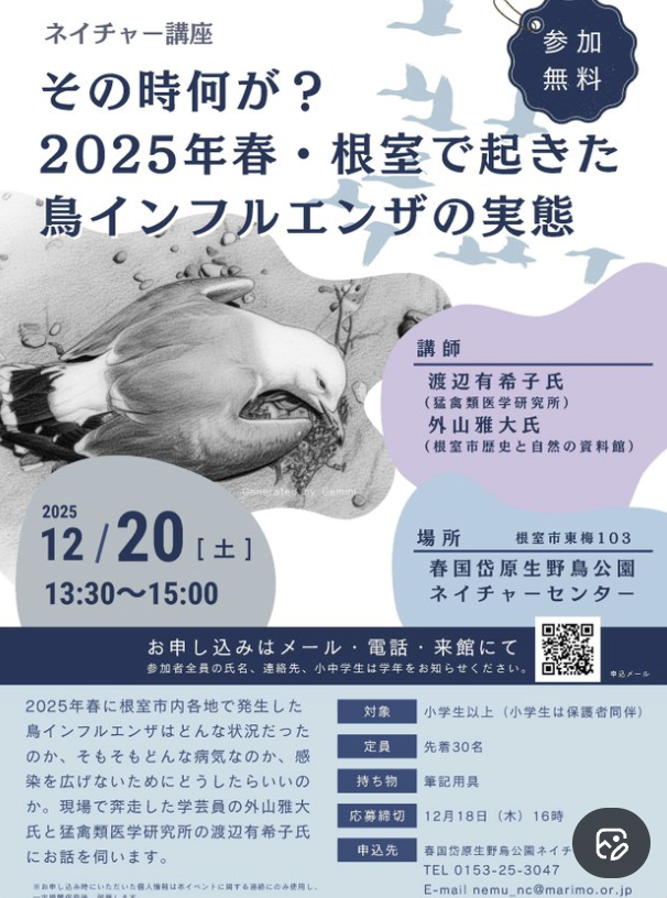 ネイチャー講座 「その時何が?2025年春・根室で起きた鳥インフルエンザの実態」 2025年12月20日(土) 13:30~15:00 春国岱ネイチャーセンター2階 対象:小学生~大人(小学生は保護者同伴)先着30名 参 […]