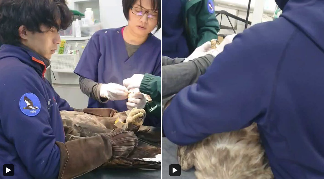 足指先に切り傷ができていたので 洗浄され、薬を塗り込まれているオジロワシ あ、くすぐったかった、かな? でも暴れず処置させてくれました ありがとー