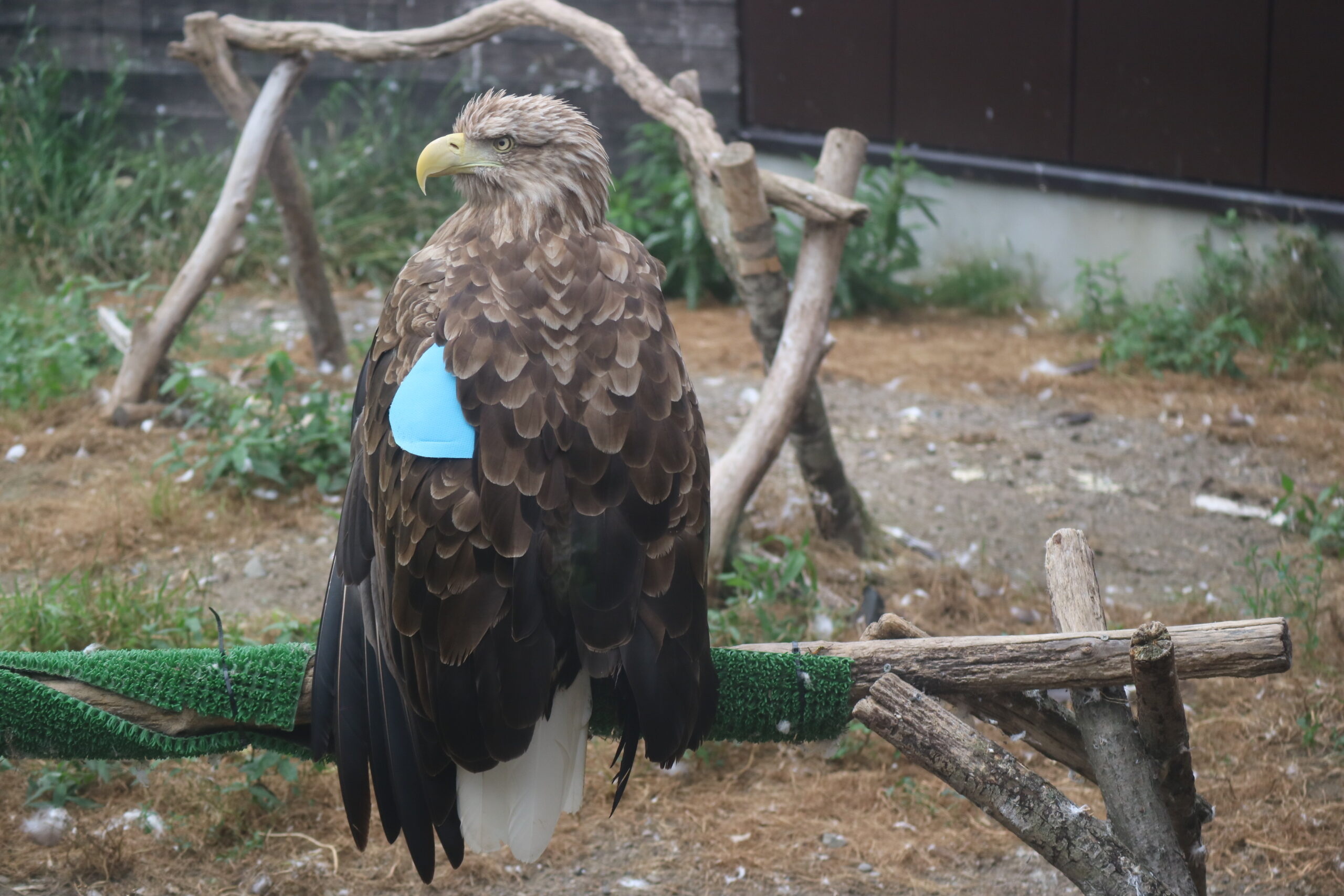 そして危険な個所への止まり防止のために、ケージ内の止まり木に様々な色や形の構造物を設置し、それに対するワシの反応を観察し、効果の検証を行っています。