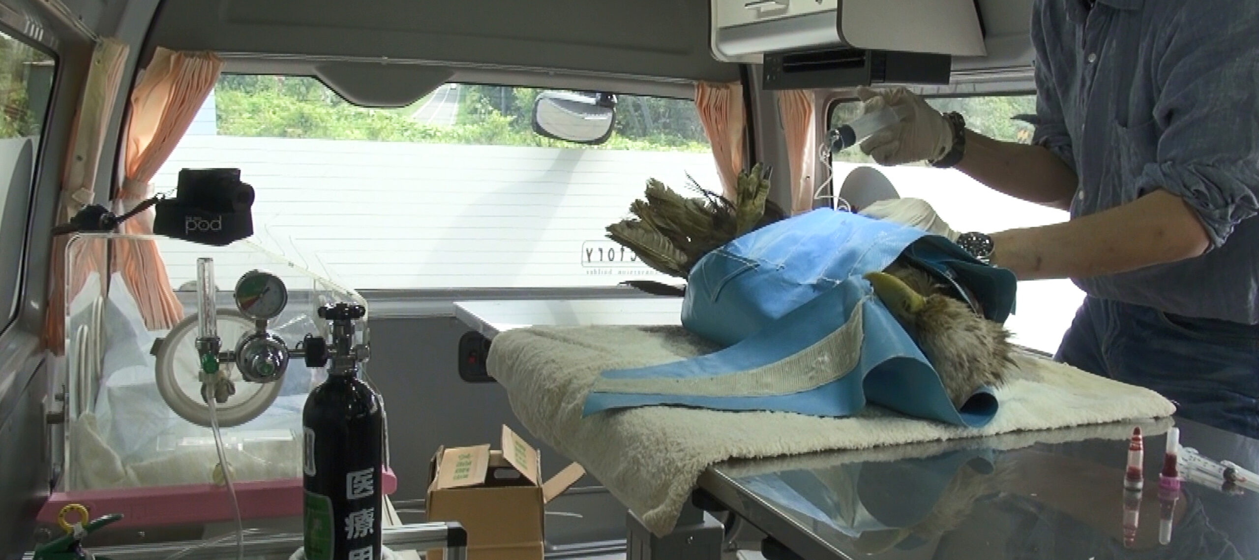 また、自動車事故に遭ったシマフクロウやワシ類における診察や解剖の結果、多くは上半身を負傷しており、路面に降りているところをはねられた可能性が高いとがわかりました。路面や路肩に放置された生物の轢死体に誘引され、採食の為に路面まで降りてきてしまっていると考えられます。