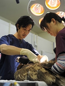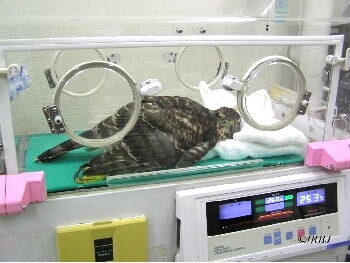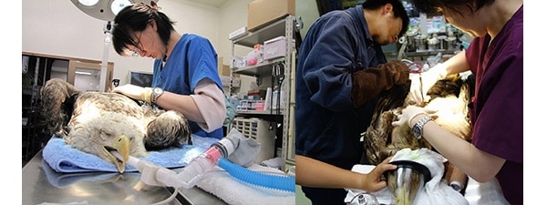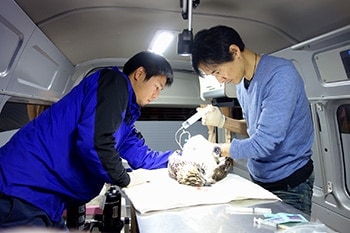 収容の瞬間から治療がスタートします。収容現場ではドクターカーの中で応急処置が開始され、その後ICUの中に収容して搬送しながら加療が継続されます。センターに到着してからは、先進的な検査・治療機器を駆使して全身麻酔下での手術などより本格的な治療が施されます。また、搬入される全ての生体を対象にPCR検査が行われ、インフルエンザウィルスの陽性が確認された個体については、別棟にある陰圧隔離室に収容した上で、環境省の了解のもと研究治療が行われています。このように、これまで治療が不可能とされていた症例についても貴重な命を救う試みが行われており、大きな成果を得ています。