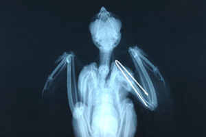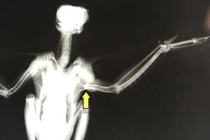 レントゲンを撮ってみると、左の上腕骨(写真では、右側の翼の根本。矢印の部分)が真っ二つに折れていました。事故直後は出血もひどかったらしく、血液の濃度が正常値の半分以下にまで下がっていました。