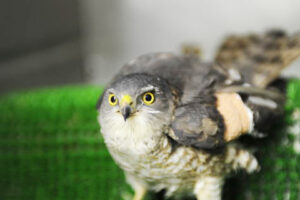 5月下旬。ハトよりも小さなタカ、ツミが保護されました。何かに衝突したらしく、左の翼に力が入りません。翼裏の皮膚に小さな穴が空いており、周辺の羽毛に血液がこびりついています。よく見ると裂傷から骨の断端が見え隠れしていました。
