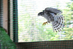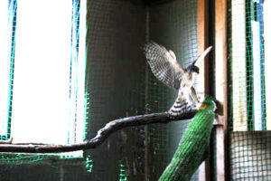 6月下旬。再び飛翔力を取り戻したツミ。狭い入院室の中でも器用に方向転換できるところは、さすが敏捷な小鳥類を狩って生活しているタカです。野生に帰るまでには、まだまだトレーニングが必要ですが、少し明るい兆しが見えてきたようです。