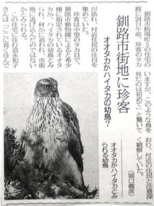 5月25日、釧路新聞の紙面に、釧路市内の市街地で中型の猛禽類が確認されたとの記事が載っていました。共に掲載されていた写真には、やや色白な若いオオタカの姿が映っていました。