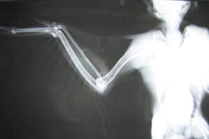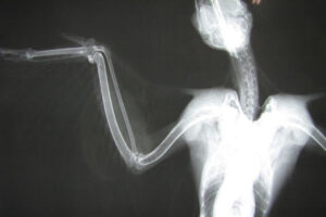 受傷後それほど時間が経っていないらしく、生々しい血しぶきが翼の裏を真っ赤に染めています。皮膚は裂け、むき出しになった筋肉や腱は所々で切断されています。さらにレントゲン検査では肘と肩の部分に脱臼が認められました。