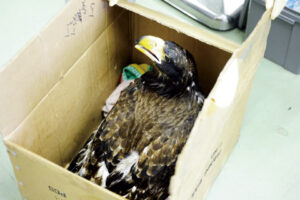 知床半島にある羅臼町の海岸で、オオワシの幼鳥が保護されました。全身ずぶ濡れで、体温も低下し、センターに着いた時には立っているのがやっとの状態でした。どうやら海に落ち、なんとか岸まで泳ぎ着いたと思われます。