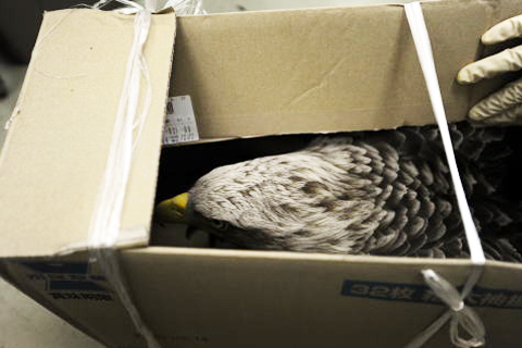 3月始め、北見市の鳥獣保護員さんから受け取ったダンボール箱の中には、オジロワシの成鳥が一羽入れられていました。健康なワシの場合、人間の気配を察すると暴れたり威嚇したりするはずなのですが、よっぽど具合が悪いらしくこちらを振り向こうともしません。
