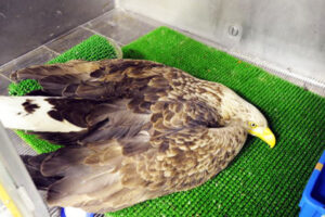 検査の結果、急性の細菌性腸炎と診断されました。入院ケージの中で腐った中型哺乳類の肉を吐き出した事から、これが原因となっていると思われました。補液や抗生物質を投与しながら、体調の回復を試みることにしましたが、ワシは数日間腹這いの状態から起き上がる事すら出来ませんでした。