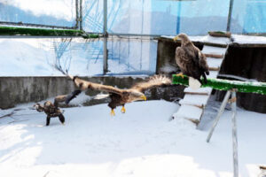 数日間の治療を経て、オジロワシはようやく立ち上がり、自力で採餌できるまでに回復しました。狭い入院室の中での生活では、飛ぶための筋力が徐々に衰えてしまう事から、中型フライングケージ内で仲間と同居しながらリハビリを開始することになりました。ケージ内に放したオジロワシは低空飛行しか出来ず、まだ身体的に本調子には至っていない事が伺い知れました。