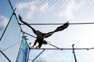 フライングケージに入れられたオジロワシは、様々な場所に配置された特殊な止まり木を飛び移りながら、徐々に翼の力を取り戻しました。