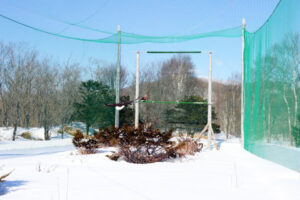 ついにリハビリの最終ステージとなる、奥行き40mの大型フライングケージに放されました。大雪が降った後だけに、ケージの中には雪が50㎝近くも積もり、すでに自然界に戻ったかのような錯覚を覚えているかもしれません。