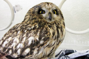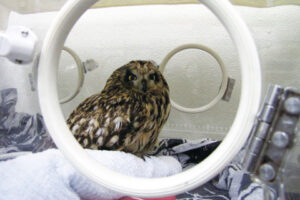 カラスに攻撃されているコミミズクを、一般市民の方が保護し野生生物保護センターに届けてくださいました。何らかの原因で雪の上に落ち、長時間うずくまっていたところをカラスに襲われたらしく、大きな氷の塊が腹部に付着していました。