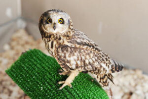 最初は地面や低い止り台の上を歩き回っていましたが、ようやく一段高い枝まで飛び上がれるようになりました。本来、コミミズクは飛翔能力に長け、狭い空間でホバリングや急旋回を行うことができます。室内のカメラで観察を行いながら、卓越した飛翔力を取り戻す訓練が始まります。足に負った凍傷の後遺症次第では、野生に戻れないかも知れませんが、コミミズクらしい余生を送ってもらうために、能力の回復に全力を尽くします。
