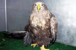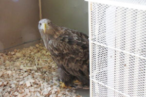残念ながらこのオジロワシは二度と野生に帰る事が出来ません。怪我の状態や負傷部位から、このワシは保護された場所の近くで車などと衝突した可能性が高いと思われます。現場を検証し、再発の防止につなげなければなりません。このワシを引き続き大切に飼育し、将来飼育下で繁殖を試みて代わりに子供を野生に返したり、傷ついた仲間を助ける供血ワシとして活躍してもらいたいと思っています。