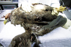 すぐに補液などの応急処置を行い、センターに運んで精密検査を行った結果、右翼の傷はすでに古いものでした。折れた骨が傷口から飛び出し、周辺の筋肉とともに乾燥していました。食べ物を全く口にできず、何日も雪深い山林をさまよっていたらしく、胸の筋肉はげっそりとそげ落ち、ひどい脱水状態に陥っていました。折れた翼の骨と接触していた右膝も、皮膚が割けて深い傷となっていました。