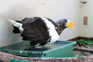 朝晩、氷点下になる日も出てきた今日この頃。寒さが厳しくなるにつれ、ワシ達の活動が活発になってきました。個室で入院中のこのオオワシも、痺れるように冷たい氷水の中で水浴びをしています。入浴は一時間近くに及ぶこともあり、「寒さに強い」というよりはもはや完全なる「寒冷地仕様」のように思えてなりません。