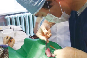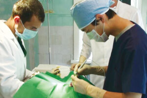 損傷が大きく、翼の切断も選択肢の一つとされていましたが、全身麻酔と点滴を行いながら、持参した機材を使って壊死した部分を丁寧に取り除き、組織を再生させる特殊なパッチを移植する手術を行いました。