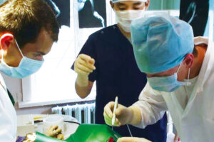 ロシア・サハリン州のユジノサハリンスク動物園から往診を依頼され、園内の動物病院でオオワシの外科手術を行いました。このオオワシは昨年夏、同島北部の巣内で、翼が折れた状態で発見され、動物園に収容されていました。専門的な処置が行われないまま、狭いケージの中で長期間飼育されていたため、骨折した部分は”くの字”に折れ曲がったまま癒合していました。