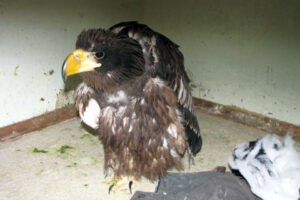 麻酔から覚めたオオワシ。翼を引きずることもなく、落ち着いた様子です。専門的な治療までに長い時間を要してしまったこのワシは、残念ながら野生に戻ることはできません。