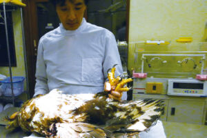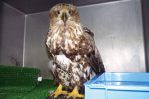 現在、オジロワシは特殊なギプスをつけて、温度管理された部屋で入院生活を送っています。心配された貧血も徐々に改善してきました。野生復帰するのは少々難しいと思われますが、将来飼育下で繁殖してもらうことにより、その子供を代わりとして野生に返せたら良いなと思っています。