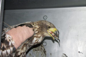 深夜10時を回った頃、根室半島から若いオジロワシが運ばれてきました。道路脇で飛べない状態でいるところを保護したとの事。意識はもうろうとし、右の翼がバッキリと折れています。傷口の乾燥が進んでおり、事故に遭ってからしばらく時間が経っていると思われました。