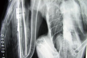 痩せ衰え、重度の脱水と貧血に陥っていた事から、長期間飲まず食わずの状態で過ごしていたことが伺えます。粉々に折れた骨の断端が、傷口から体外に飛び出ており、オジロワシは自分の翼を引きずりながら、痛みや飢餓と闘っていたようです。