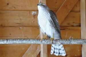 2008年1月、襟裳岬の西に位置する様似町の国道脇で保護された若いハイタカです。大きな外傷はありませんでしたが、吐血と脳震盪による意識障害が見られ、交通事故に遭ったと思われました。とても神経質な種ですので、リハビリ飼育中はもっぱら小型のCCDカメラを使って治療の経過を観察しました。