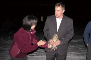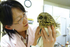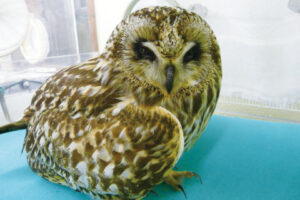 2009年1月、釧路市内の道路脇で衰弱して発見されたコミミズクです。交通事故で頭を強打したと思われ、脳障害により目は見えず、バランス感覚も失って、ただ頭を揺り動かしながら立ちつくすだけの状態でした