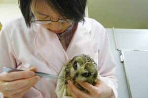診察や治療の際に猛禽類が暴れると、獣医師と鳥の双方が思わぬ怪我を負ってしまいます。安全性を保ちながら、鳥を優しく保定※するために、小型猛禽類用の”特殊な上着”を着せて診療に当たります。 ※安全に動けないようにする事