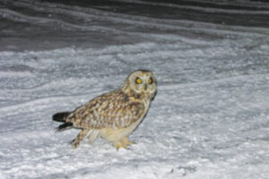 雪の上に放たれたコミミズクは、一瞬立ち止まってこちらを振り返り、まもなく音も無く夜空に飛び立ちました。私達の真上をゆっくりと大きく円を描くように飛んだのち、漆黒の湿原へと消えて行きました。