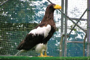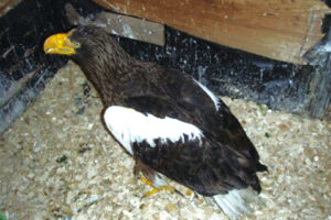 まだ完治にはいたりませんが、だいぶ痛みが取れたようで高い止まり木にも止まれるようになりました。現在は、屋外のケージで他のオオワシともに療養しています。早く野生に戻れる事を願っています。