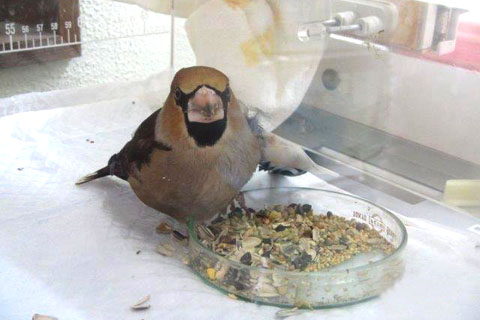 釧路市内でシメが保護されて来ました。左翼の左手根部が折れていたので、翼を広げた状態でギプスを当ててテーピングしました。