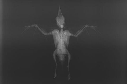 ヒヨドリのレントゲン写真を撮影したところ、左の烏口骨が折れていることがわかりました。烏口骨は翼の支柱となる骨で、胸骨と繋がっています。小さな鳥では手術によっての整復は困難なので、自然治癒に頼ることになりました。飛ばないように小さな鳥籠に入れ経過観察することになりました。