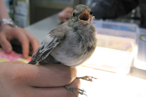 ハエ取りテープに絡まってしまったと運ばれてきたのは、ハクセキレイのヒナでした。羽毛に粘着物質がへばりついてしまい、除去にとても労力がかかりました。洗剤で洗っても落ちない場合のほうが多く、羽毛を濡らすと体温が下がってしまい薬品による負担もあるので使いません。小麦粉をまぶし丁寧に擦って取り除きました。抜けてしまった羽が生えそろったので放鳥することができました。