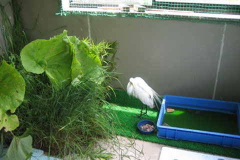 美しい水鳥も収容されました。飾り羽をはためかせて登場したのはチュウサギです。白いサギをまとめてシロサギといいますが、大きいものをダイサギ、中くらいのものをチュウサギ、小さいものをコサギと呼びます。脚や嘴の色でも区別することができます。切り身の魚を全く食べてくれず、生きた小魚を調達するのにとても苦労しました。特設飼育部屋は気に入ってくれたようで、衰弱して収容されてから2週間ほどで回復し放鳥しました。