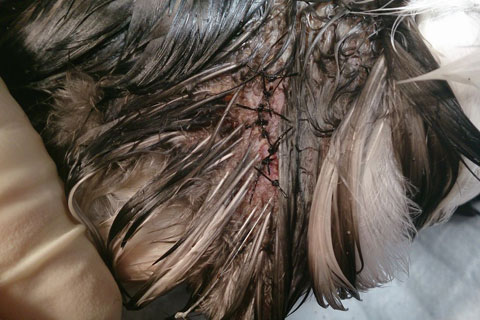 成鳥とは随分見た目が違うため、はじめは私たちも首をひねったのですが、嘴の突起が決め手となり、ウトウの幼鳥とわかりました。海岸でカラスに襲われていたところを発見され保護されました。一般状態は悪くありませんでしたが、よく見ると右脚の付け根につつかれた跡と思われる穿孔があったため、洗浄したのちに縫合を行いました。