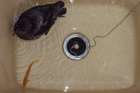 ウトウの巣立ちは、海鳥の例にもれずかなり早い段階で行われますが、センターに運ばれた個体は目立って小さいように思われました。巣立ち雛であれば傷が治れば放鳥できますが、巣立ち前となると放鳥しても生きていけません。詳しい方にお聞きした結果、通常の巣立ち雛の半分の体重であることがわかりました。何らかの原因で巣立ち前に巣穴を出てしまったようです。もう少し体重を増やしてから放鳥する必要があります。