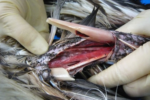 実は今回、同じ場所で2羽のコアホウドリの死体が収容されています。本来は外洋で暮らすコアホウドリがほぼ同じ時に3羽も回収されるだけでも異常なことですが、さらに驚いたのは死体も上腕骨が同じように折れていて、人為的な障害の可能性が考えられました。海鳥では漁網や漁具による混獲が問題となっています。どのような状況でこのような悲惨な障害を負ったか確証はありませんが、ちょっとした気遣いや工夫で防げた事故に思えてなりません。